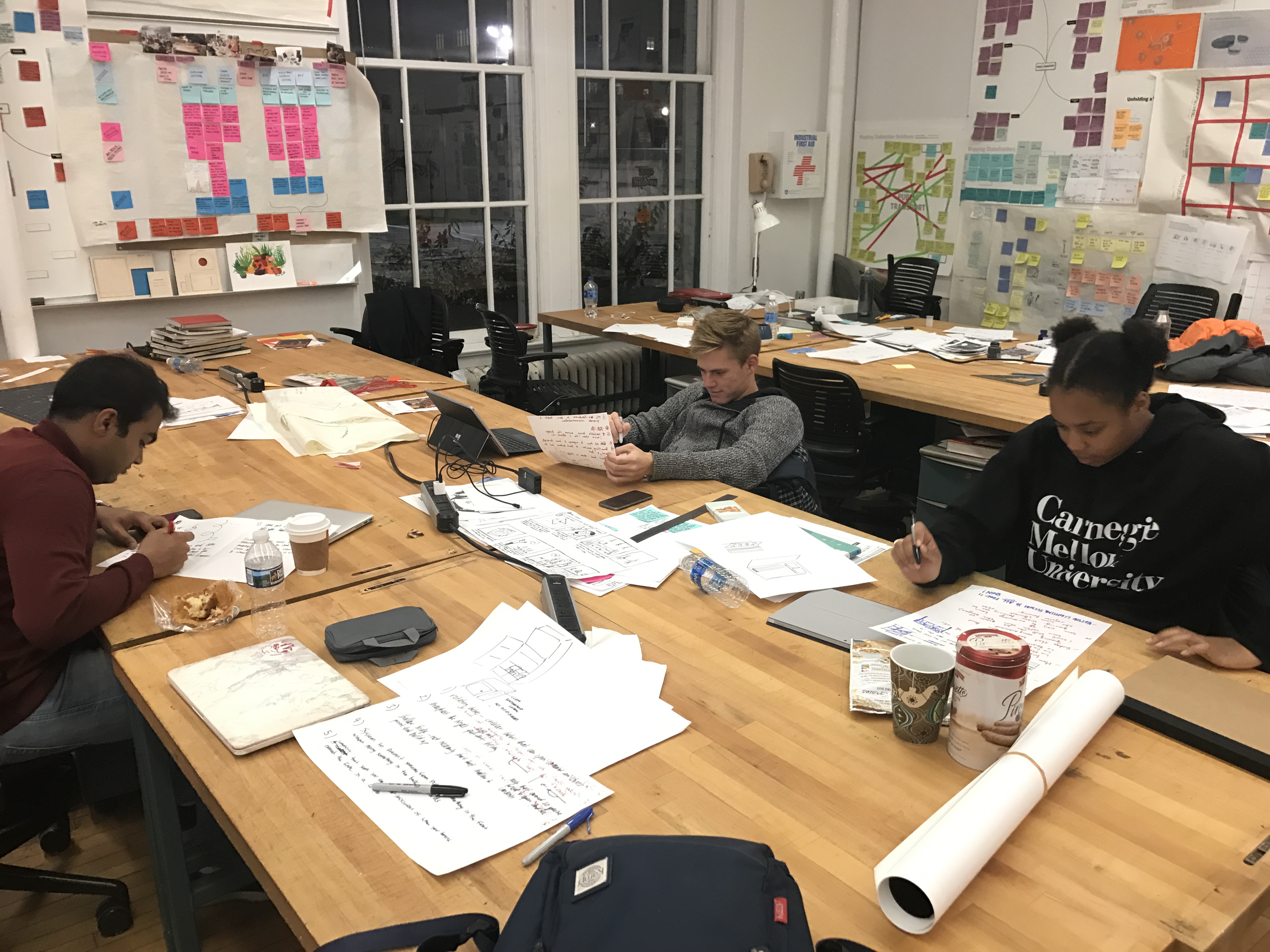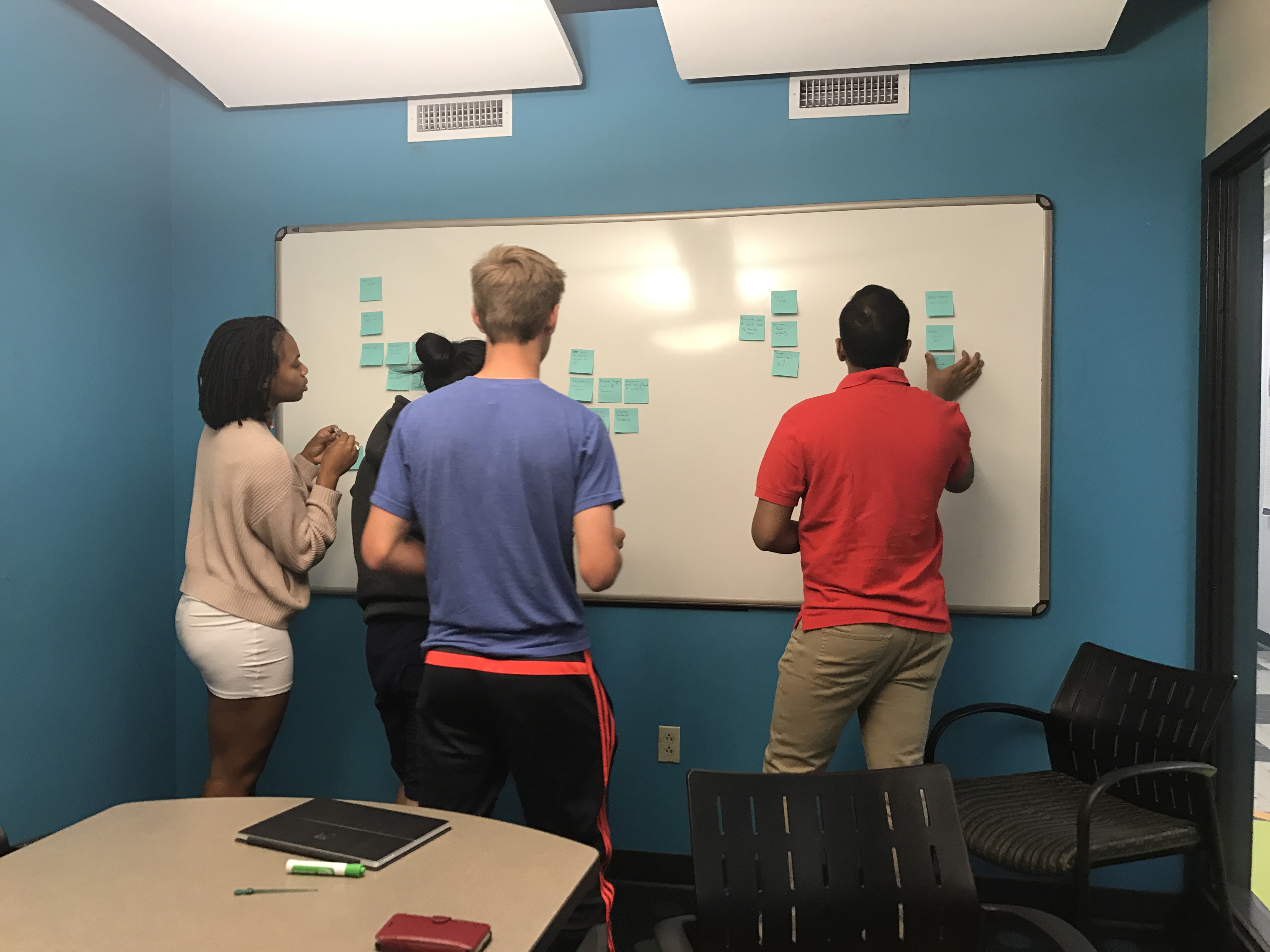 We began brainstorming by using a method where each group member ideates and sketches 4 new solution concepts in five minutes. After time expires, each paper is passed in a circle to a different team member who either improves the ideas or uses them to spark new ideas in another 5 minute interval. This process repeats until the original paper is back in the creator's hands. From this exercise, we were able to generate about 50 ideas that were then placed into 5 categories using affinity mapping.