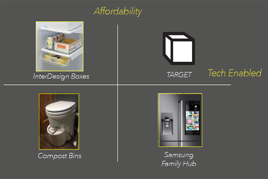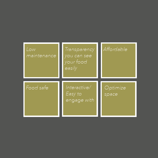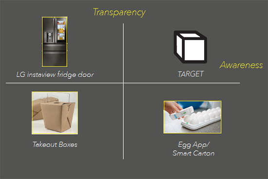 This map compared a physical aspect, transparency, with a more enabling, intangible aspect, awareness. These two concepts are similar; in that, they assist the user in knowing what is going on with their food. We decided on these axes because we found that young adults have not yet found the balance between groceries and takeout and pack things into their fridges without thought. As a result, food gets wasted because people overbuy, lose food, or improperly store food. These axes will help us find a solution that increases their knowledge and will hopefully inform behavior.