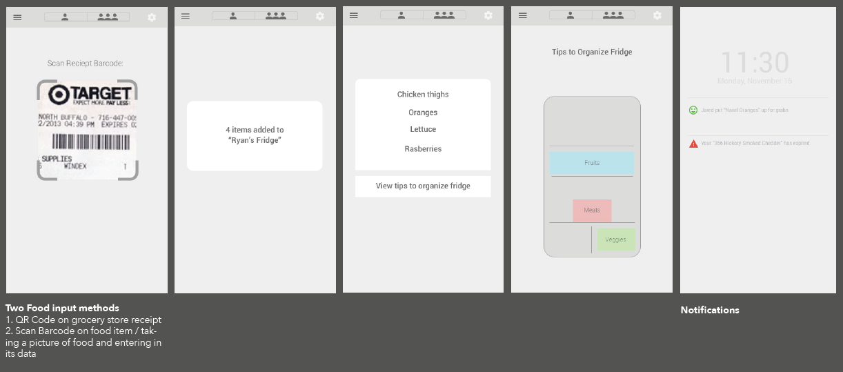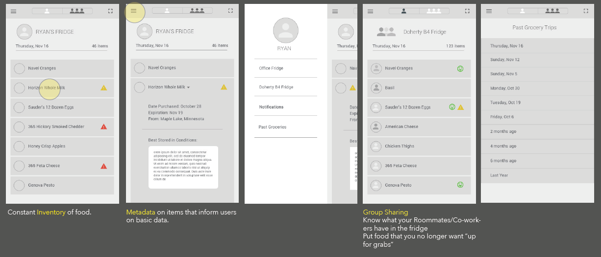 Once a user has scanned or entered in an item into the app, it gives suggestions on where to store it in the fridge based on proper storage practices and what else is currently in the fridge. For example, if a user buys produce and chicken and has a roommate, it suggests a spot where the chicken is below the produce while still keeping enough separation from the roommates stuff to stay organized. All of a user’s food items can be easily seen when the app is opened, and clicking the drop down menu allows the user to find all of the relevant data such as purchase date, expiration date, and where the food came from. Another feature of the app that optimizes food consumption is the ability to put something “Up for Grabs” in a shared fridge. This allows users to offer up their unwanted food items to their friends and coworkers easily, and giving the ability to request a food item in a shared space offers a solution to food stealing.